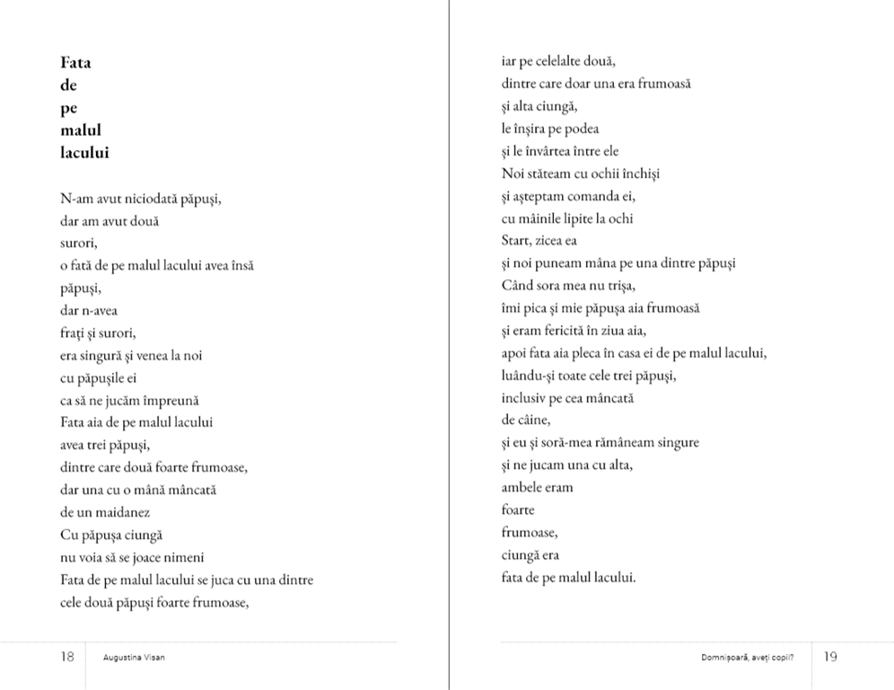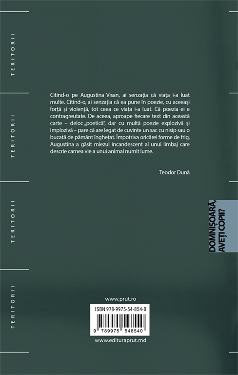 După un debut excelent în colecția Pulsar, Augustina Visan revine cu volumul de poezie “Domnișoară, aveți copii?” în colecția Tetitorii. Un volum puternic, violent și sensibil în egală măsură.”