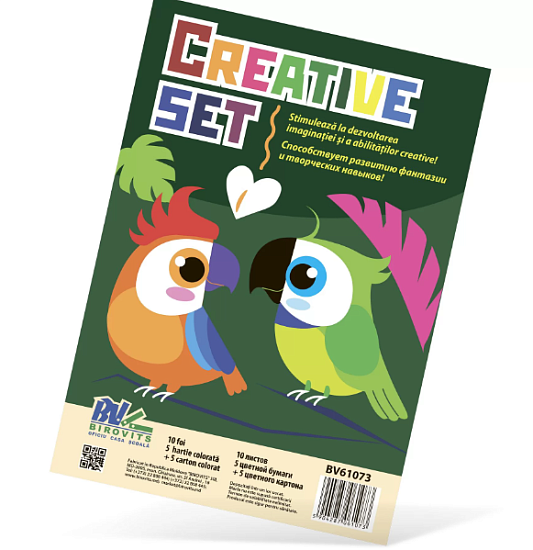 Set de creativitate: Hîrtie colorată pe ambele părţi, 5 culori, 5 foi, format A4 si carton colorat pe ambele parti, 5 culori, 5 foi, format A4.