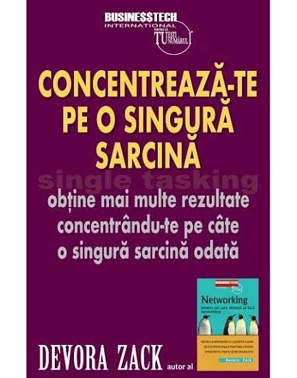 Aceasta carte iti ofera un sistem simplu, cu instrumente flexibile, pentru a te ajuta sa-ti pastrezi concentrarea asupra a ceea ce conteaza cu adevarat. Vei invata cum sa-ti stapanesti mintea, mediul si pe toti acei oameni pisalogi care se aseaza in calea potentialului tau. Citind aceasta carte vei intelege concepte care iti vor permite sa finalizezi in mod constant ceea ce incepi. Concentrandu-te asupra unei singure sarcini pe rand, vei realiza mai mult si te vei bucura de relatii mai profunde si mai solide. Dar cum ramane cu distragerile? Vei invata sa diminuezi distragerile care apar in mintea ta si pe cele care te pandesc la locul de munca.