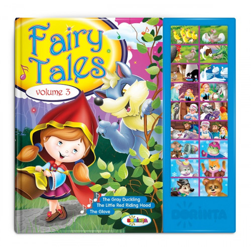 16 pagini cartonate + 18 sunete, 3 povesti sonore: The gray duckling, The little red riding hood si The glove