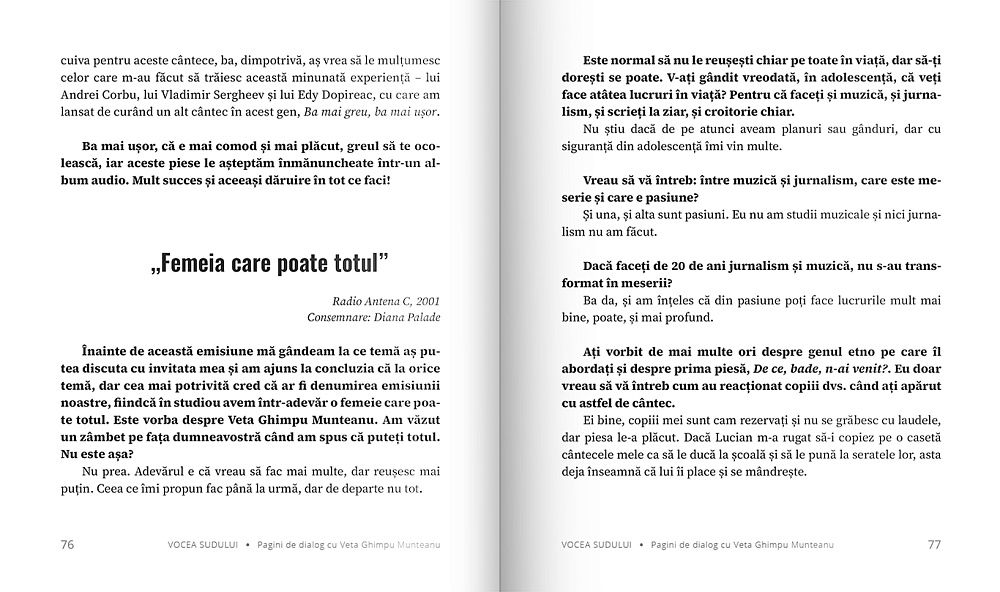 Cartea de interviuri „Vocea Sudului”, semnată de Dumitru Crudu și Maria Pilchin, reprezintă un proiect editorial deopotrivă cultural, identitar și confesiv. Inițial gândit ca un „taifas” cu artista, volumul a căpătat consistență prin integrarea mai multor interviuri jurnalistice, Lucrarea depășește granițele genului jurnalistic și se constituie într-un document al memoriei culturale basarabene, unde personalitatea Vetei Ghimpu-Munteanu se dezvăluie în plenitudinea ei.