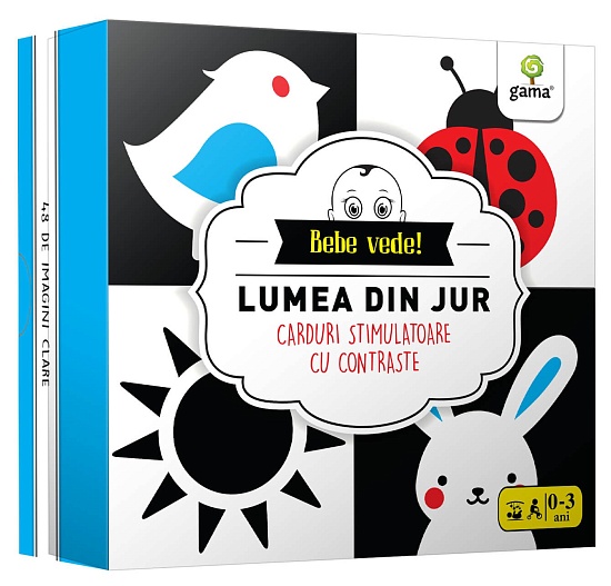 Cutia conține 24 de carduri contrastante pentru stimulare vizuală: