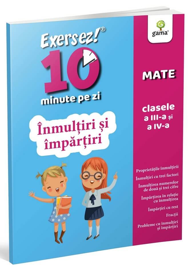 Pentru a atinge succesul academic, orice elev trebuie să exerseze în fiecare zi cunoștințele dobândite la școală. Doar 10 minute pot fi suficiente pentru formarea unei rutine de lucru zilnic, care îl ajută pe copil să înțeleagă mai bine ceea ce a învățat, iar pe părinte – să observe și să evalueze progresele. Caietul de activități suplimentare Înmulțiri și împărțiri din colecția Exersez 10 minute pe zi conține: proprietățile înmulțirii, înmulțiri cu trei factori, înmulțirea numerelor de două și trei cifre, împărțirea în relație cu înmulțirea, împărțiri cu rest, fracții și probleme cu înmulțiri și împărțiri.