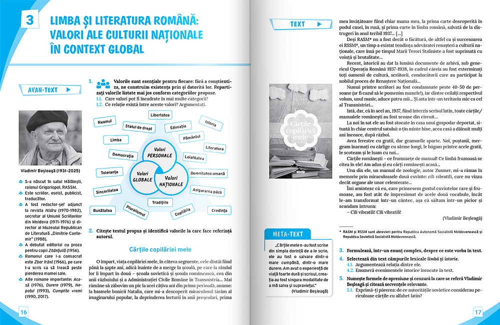 Manualul este elaborat în baza Curriculumului disciplinar și este câștigător la licitația de manuale școlare din 2025. Elaborat de aceeași echipă care a scris manualele de limbă română pentru clasa a X-a și clasa a XII-a – Natalia Grîu, Viorica Oleinic, Bogdan Rațiu, Ramona Jitaru. Asigură consecutivitatea studierii literaturii în diacronie, cu distribuirea conținuturilor curriculare la treapta liceală. Este singurul manual din RM care integrează scheme recapitulative, tabele și sinteze potrivite pregătirii de sine stătător pentru examenul de bacalaureat.