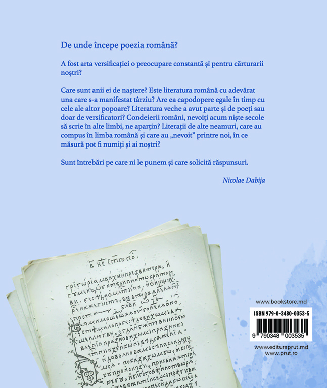 Antologia „Poezia românească dinainte de Dosoftei” include primele versificări din cultura noastră de la Ovidiu la Dosoftei și de la poezie la imnuri religioase, selectate atât pentru vechimea lor, cât și pentru valoarea lor literară. O muncă uriașă depusă de regretatul Nicolae Dabija, care a realizat o operă unică în literatura română. Antologia cuprinde poeme din secolul I până în secolul XVII. O călătorie în timp și un eveniment literar unic.