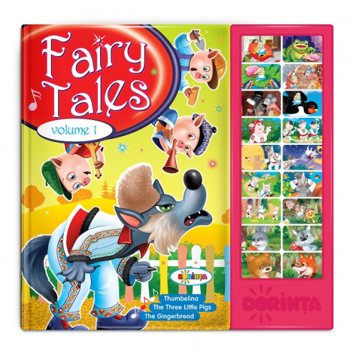 16 pagini cartonate + 18 sunete, 3 povesti sonore: Thumbellina, The three little pigs si The gingerbread