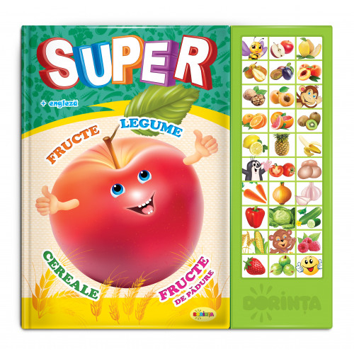 Micii curioși vor putea da pagina, apăsa pe butoane și urmări ilustrațiile viu colorate, învațând denumirea fructelor și legumelor, atât în limba română, cât și engleză.