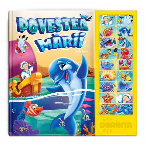 Micii curioși pot da pagina, apăsa pe butoane și urmări ilustrațiile viu colorate care reprezintă viețuitoarele marine.