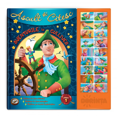 Micii aventurieri vor răsfoi paginile și-l vor însoți pe Guliver în Țara Piticilor, în Țara Uriașilor și pe Insula Îngâmfaților. Iar apăsând pe butoane vor putea audia ce-i așteaptă în continuare.