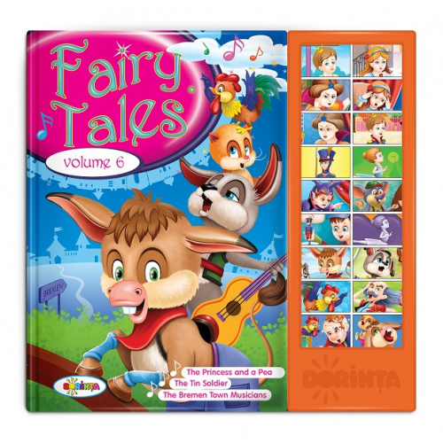 16 pagini cartonate + 18 sunete, 3 povesti sonore: The princess and a pea, The tin soldier si The Bremen town musicians