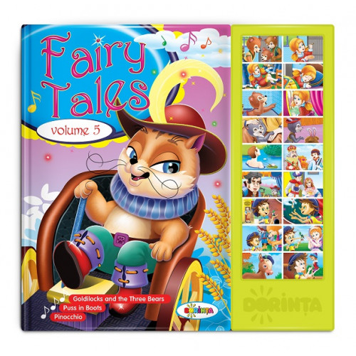 16 pagini cartonate + 18 sunete, 3 povesti sonore: Goldilocks and the three bears, Puss in boots si Pinocchio
