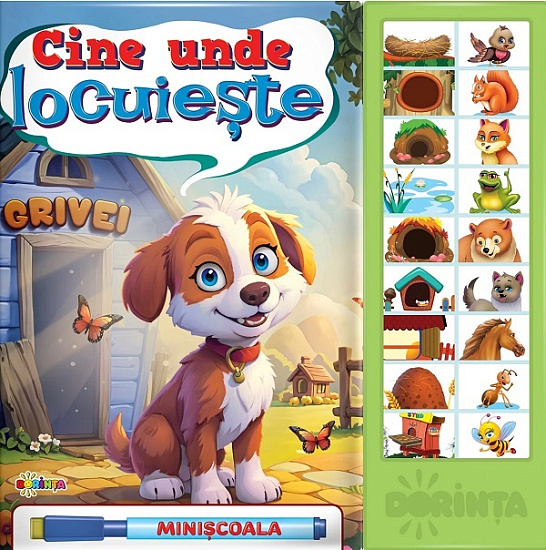 Carte cu sunete. Cine unde locuieste, propune o serie de activitati de genul: uneste cu raspunsul potrivit, afland astfel informatii despre locuintele vietatiilor.