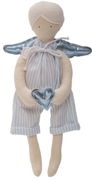 Această păpușă textilă „Înger” pare creată pentru a dărui căldură. În imaginea ei se regăsesc gingășia, grija și dragostea profundă. Ține în mâini o inimioară roșie brodată cu paiete — simbolul iubirii sincere și necondiționate. Rochia albă din bumbac este decorată cu dantelă fină, iar pe spate poartă aripi moi de înger. Jucăria este cusută manual din materiale naturale și sigure.