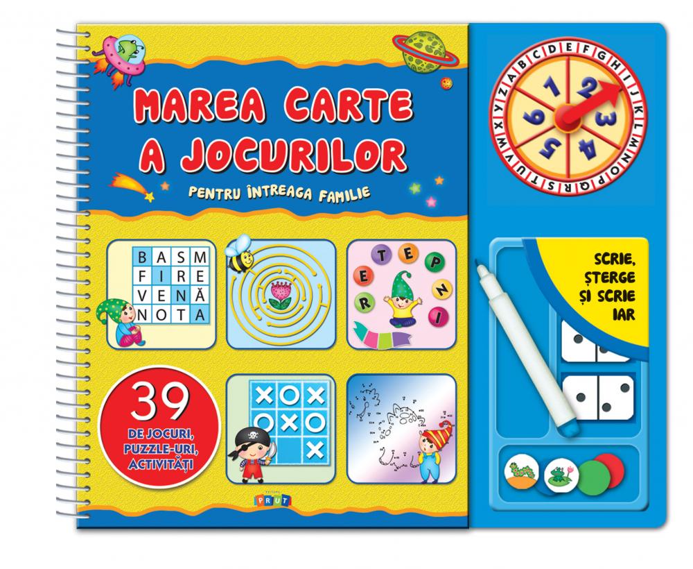 Această carte conţine 39 de jocuri interesante şi populare, de care se poate bucura întreaga familie. Copilul se va distra jucând dame cu tata, descoperind o nouă planetă împreună cu mama, rezolvând careuri de cuvinte încrucişate, puzzle-uri sudoku sau făcând diferite activităţi de unul singur! Sunt reunite toate aici, în această carte minunată, plină de culoare. Cartea conţine regulile jocurilor, piese de joc, un disc cu o săgeată rotitoare, pagini reutilizabile şi două markere speciale pentru scris şi desenat. Copilul poate să şteargă paginile pe care a scris cu un şervețel şi să o ia de la capăt.