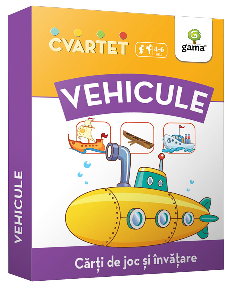 Cvartet • Vehicule este un joc de cărți educativ. În timp ce încearcă să formeze cele mai multe „cvartete” pentru a câștiga, copilul învață despre diverse mijloace de transport, își îmbogățește vocabularul și socializează cu alți copii.