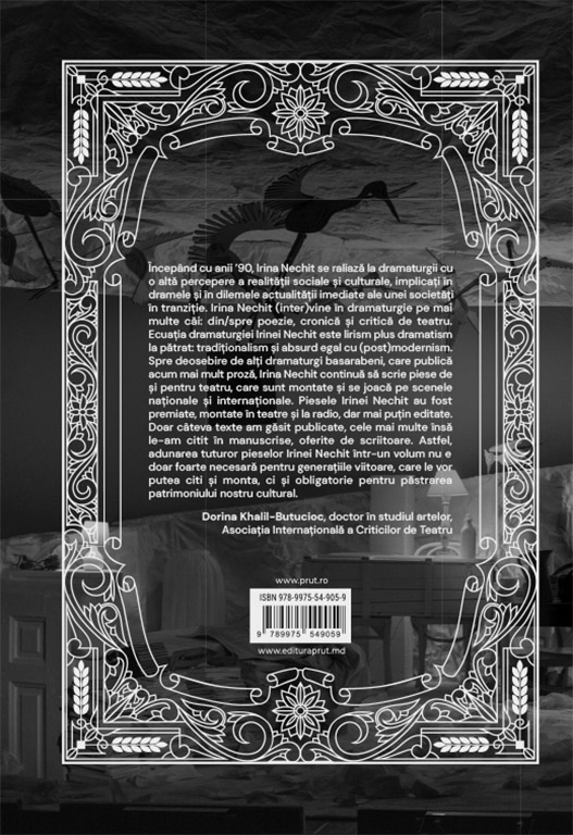 După douăzeci de ani de când scrie dramaturgie, a venit momentul ca scriitoarea Irina Nechit să-și publice piesele într-un volum care să demonstreze o dată în plus valoarea sa incontestabilă. De la comedii satirice la drame, teatru-document, monodrame, autoarea surprinde atât pe scena teatrelor cât și în lecturarea acestei cărți. O carte necesară pentru dramaturgia românească......