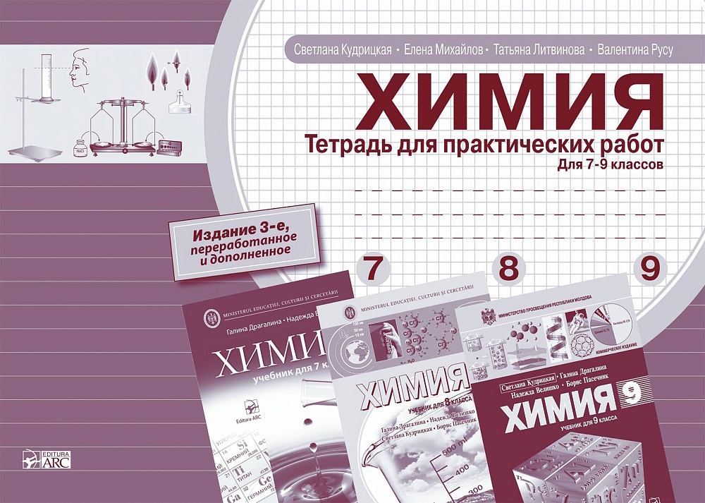 Caiet de lucrari practice la chimie, pentru clasele 7-9, revăzute  și completate în conformitate cu prevederile Curriculumului la disciplină (ediția 2019) și cu manualul Chimia (ediția 2020), aprobate de Ministerul Educației, Culturii și Cercetării.