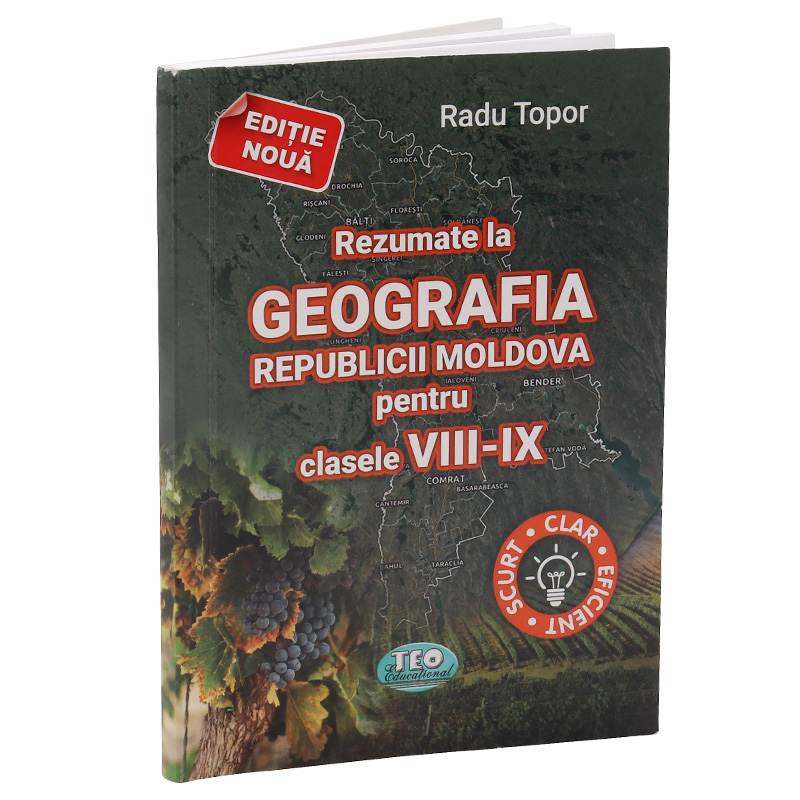 Acest manual realizat pentru a descoperi rolul geografiei, a înțelege fenomenele și rolul ei în timp, ajutând elevii să studieze cu mai mult interes gografia Moldovei și să fie atenți la rolul teritorial. Acest rezumat scapă elevii de obositoarea luare de notițe și permite susținerea unor lecții interactive, mult mai apreciate de elevi decât cele de tip clasic.