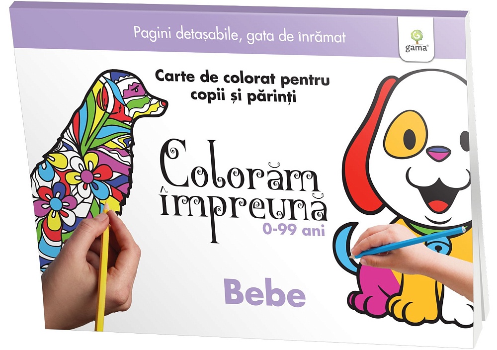Cartea Colorăm împreună • Bebe include 20 de coli de colorat pentru copil, cu desene mari și contur gros, și 20 de coli pentru părinte.