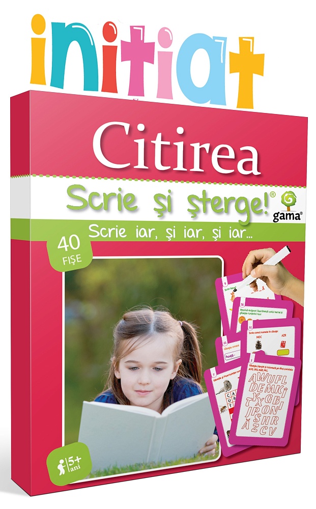 Cardurile Scrie și șterge sub forma unor fișe de lucru refolosibile ajută copilul să exerseze mai întâi citirea cuvintelor scrise cu litere mari de tipar și scrierea cu majuscule a cuvintelor, apoi citirea cuvintelor scrise cu litere mici de tipar și a propozițiilor. Colecția Scrie și șterge! Inițiat este recomandată copiilor cu vârste între 5 și 7 ani și urmărește să dezvolte, într-un mod atractiv, competențele acestora. Cu ajutorul fișelor plastifiate și al cariocii nepermanente, preșcolarii vor afla mai multe despre mediul înconjurător, vor exersa scrierea cu litere cursive și citirea, vor învăța să numere până la 30 și să facă adunări și scăderi simple. Prin intermediul acestor fișe, copilul va cunoaște literele și va ști să scrie. În același timp, micuțul își va îmbunătăți capacitatea de concentrare, atenția și motricitatea fină. Pachetul face parte din colecția „Scrie și Șterge! Inițiat” care contine carti pentru copii 5-7 ani.