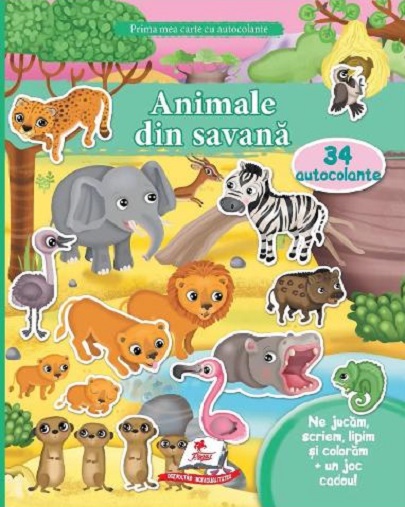 Prima mea carte cu autocolante: Animale din savana. 34 autocolante - Ne jucam, scriem, lipim si coloram + un joc cadou!