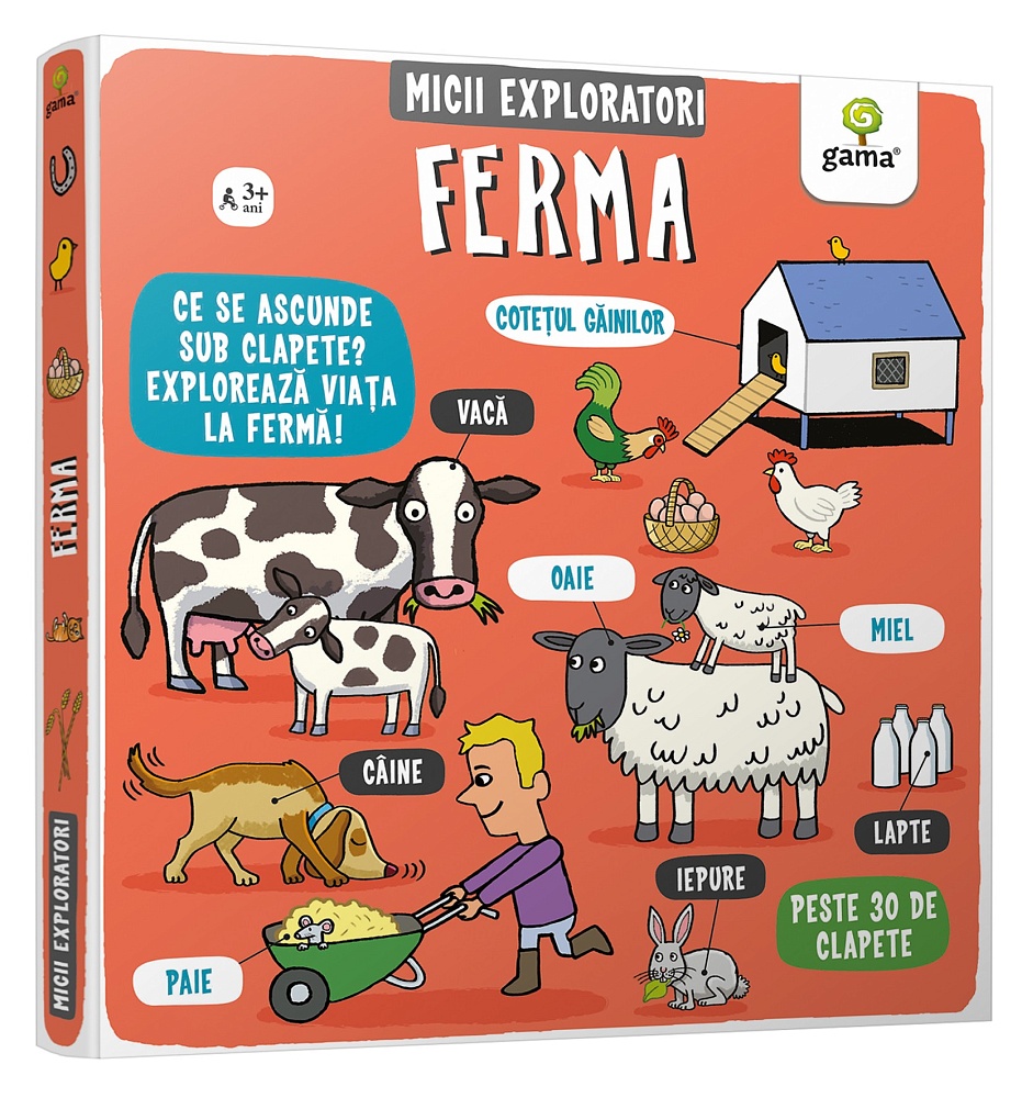 Ce animale trăiesc la fermă? Cum arată o zi din viața unui fermier? Cum se mulg vacile și cum se tund oile? Ce recolte se obțin și cu ajutorul căror mașini? Descoperiți în această enciclopedie pentru micuți tot ce vreți să aflați despre culturile agricole și creșterea animalelor, dar și multe alte informații interesante, „ascunse” sub cele peste 30 de clapete.