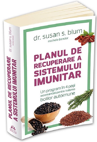 Glutenul, metalele grele din mediul inconjurator, toxinele, infectiile si stresul de zi cu zi pot declansa afectiuni autoimune. Abordarea revolutionara pe care o propune Planul de recuperare a sistemului imunitar se concentreaza pe recuperarea sistemelor de baza ale corpului – regimul alimentar, nivelul hormonilor de stres, starea de sanatate a intestinelor si cantitatea de toxine din corp – in 4 pasi simpli. Ajutandu-si pacientii sa isi schimbe comportamentele de viata, sa manance sanatos si sa isi reduca nivelul de stres, dr. Susan Blum le reda oamenilor sentimentul ca au controlul asupra a ceea ce se intampla cu propriul corp si ca bolile autoimune nu sunt un diagnostic pe care trebuie sa si-l asume pentru restul vietii.