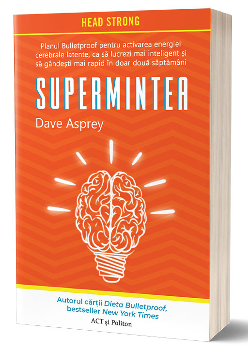 Supermintea: Planul Bulletproof pentru activarea energiei cerebrale latente, ca să lucrezi mai inteligent și să gândești mai rapid în doar două săptămâni / Head Strong: The Bulletproof Plan to Activate Untapped Brain Energy to Work Smarter and Think Faster-in Just Two Weeks de Dave Asprey este cartea care te va ajuta să atingi un nivel de performanță mentală mai ridicat. Dave Asprey îți va arăta ce schimbări relativ simple poți face în stilul tău de viață pentru a ajunge la un nivel de energie cerebrală mai mare, pentru a te concentra mai bine, a reține mai multe informații și a gândi mai creativ.