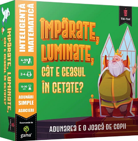 Toți supușii din regat vor să-l vadă pe Împărat! Dar numai unul poate avea această onoare. În acest joc educativ, trebuie să te întreci cu adversarii și să fii primul care ajunge la palatul împărătesc. Alege cele mai potrivite misiuni, gestionează cu atenție resursele pe care le ai, rezolva adunări simple și parcurge traseul, folosindu-te de abilitățile tale de strategie. Deși e simplu în aparență, Împărate, luminate, cât e ceasul în cetate? dezvoltă gândirea analitică a copiilor, oferind în același timp ore întregi de distracție! Jocul conține: • Planșă de joc • 39 de cărți Misiuni • 84 cărți Pași • 4 pioni • Regulament Cu Tiki-Tan vei găși cele mai antrenante, haioase și captivante jocuri pentru copii, fie ei mai mici sau mai mari. Ele îmbină armonios educația cu distracția și dezvoltă atenția, concentrarea și perspicacitatea. Ce mai aștepți? Hai la joacă!